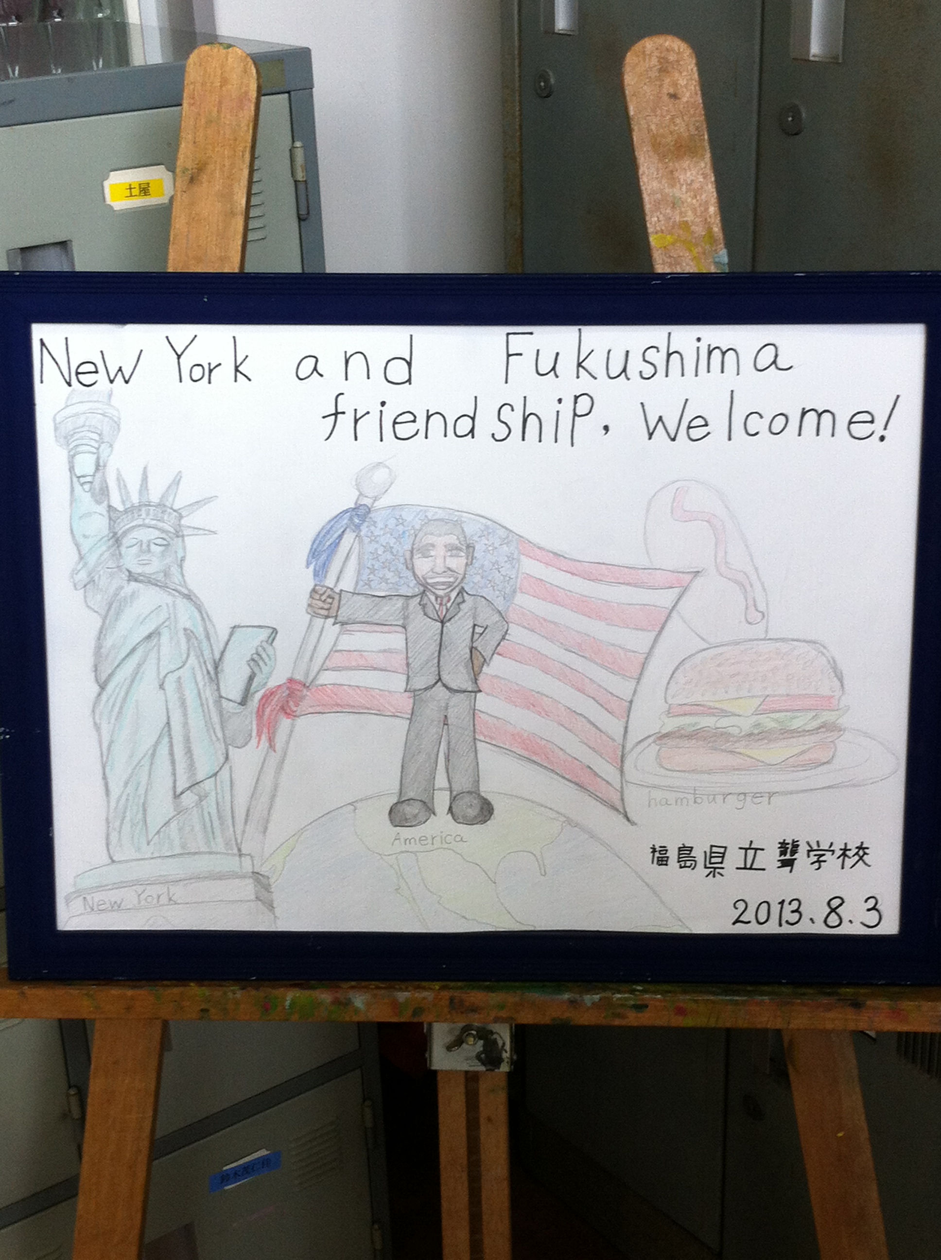 First stop was the school of the deaf. We were welcomed by a poster that they had made for us. (note: President Obama, hamburger, hot dog, the flag and statue of liberty) After we took off our shoes and slipped into slippers, we were escorted through the school to an all-purpose type room and greeted with smiles and clapping. The principal told us about the school which is for preschoolers to high schoolers. The high school students were our hosts. After a few speeches that were translated not just into English but also into sign language, we were served tea and a pudding type dessert. We then broke into small groups and the students introduced themselves using pads of paper that had their names and what they enjoyed doing written in English. The first student said “he liked to read books.” I told him in English and pointing to myself, smiling and pretending to hold a book that “I liked to read books.” He smiled. Another student mentioned he liked comic books. One of my fellow travelers said “he liked to read Superman when he was young.” One of the kids outlined an “S” on his chest which caused laughter. Our time concluded with a group photo and the phrase “one more” was used for the first time and would continue to be used for the entire trip. 🙂