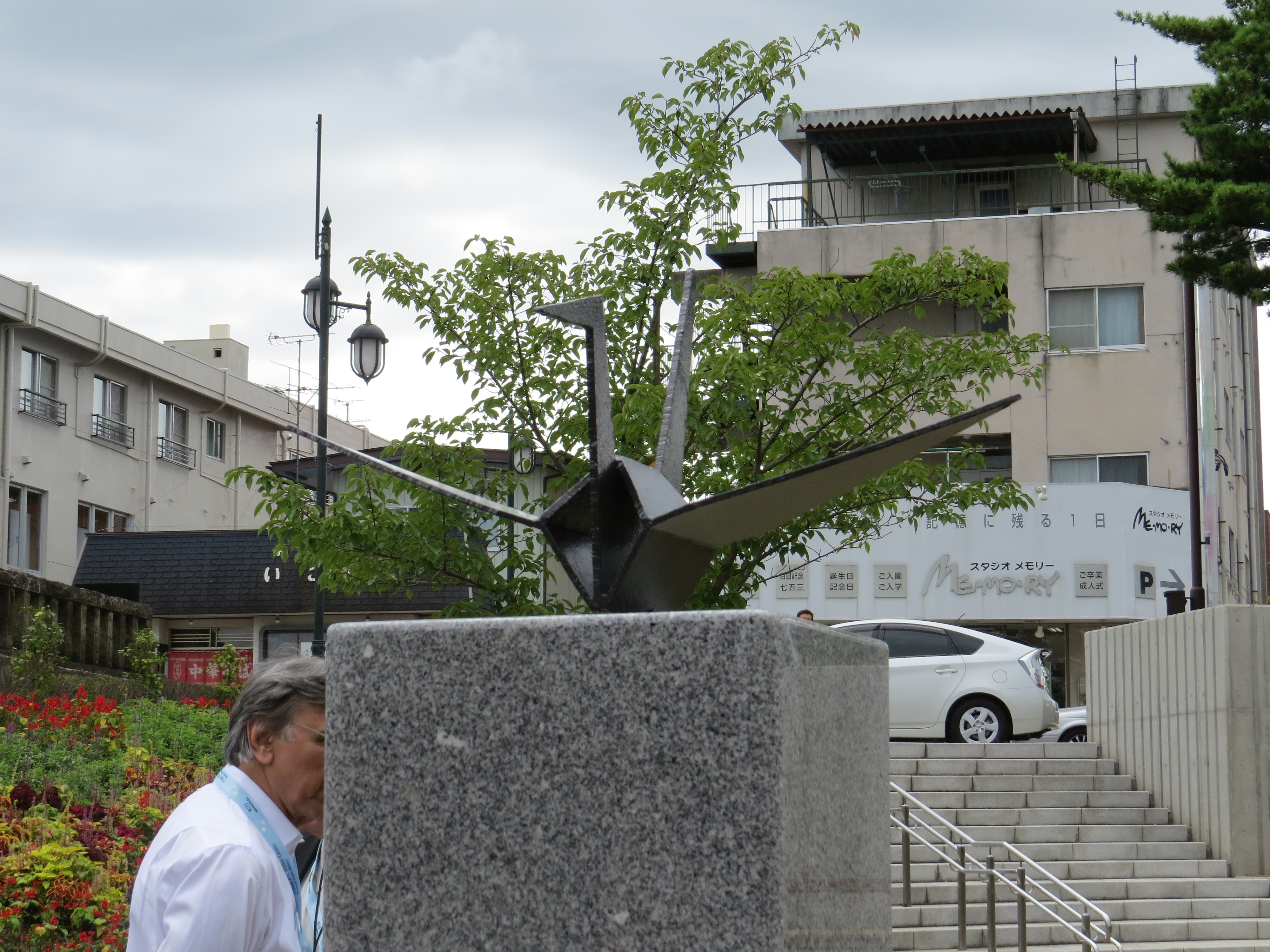 Our next stop was lunch at a Japanese Restaurant. Shoes off again but this time our shoes were handed in to a shoe (coat) check instead of being left by the door. Lunch was delicious. I ate most of it after questioning my fellow travelers as to “what was what.” I did eat with chopsticks. After lunch we walked across the street to Kaiseizan Park to see the Soaring Crane Memorial. This visit was so special on so many levels. Last October the group from the Tribute Center had delivered the crane, which is made out of WTC steel, to the people of Japan. The mayor of Koriyama and the press joined us at the memorial so there were many photos. Smile!! One more!! Also joining the group was the nephew of Sadako, who is the young girl whose vision of world peace is celebrated by the crane story. Worth reading if you aren’t familiar with her story – Sadako and the thousand cranes. The crane in the park is positioned to point towards New York. FYI: one of Sadako’s original cranes is at the Tribute Center in New York.